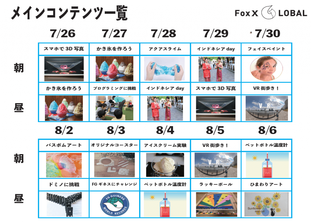 この夏休みにフォックスグローバルで行うサマースクールのメインコンテンツスケジュールを公開するよ!! プログラミングやクッキング、おもしろ実験や外国人のお友達と実際に交流するなどここでしかできないコンテンツばかりだからみんなこの夏は絶対フォ... -