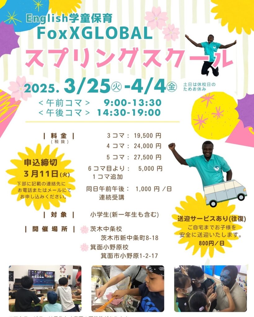 2025年スプリングスクール開催決定!!! たくさんのご参加お待ちしております! 【概要】 ①日程 3月25日~4月4日 ※土日は休校日のためお休み ②対象 小学生(新一年生も含む) ③時間 午前コマ:9:00~13:30 午後コマ:14:30~19:00 ④開催場所 茨木中条... -
