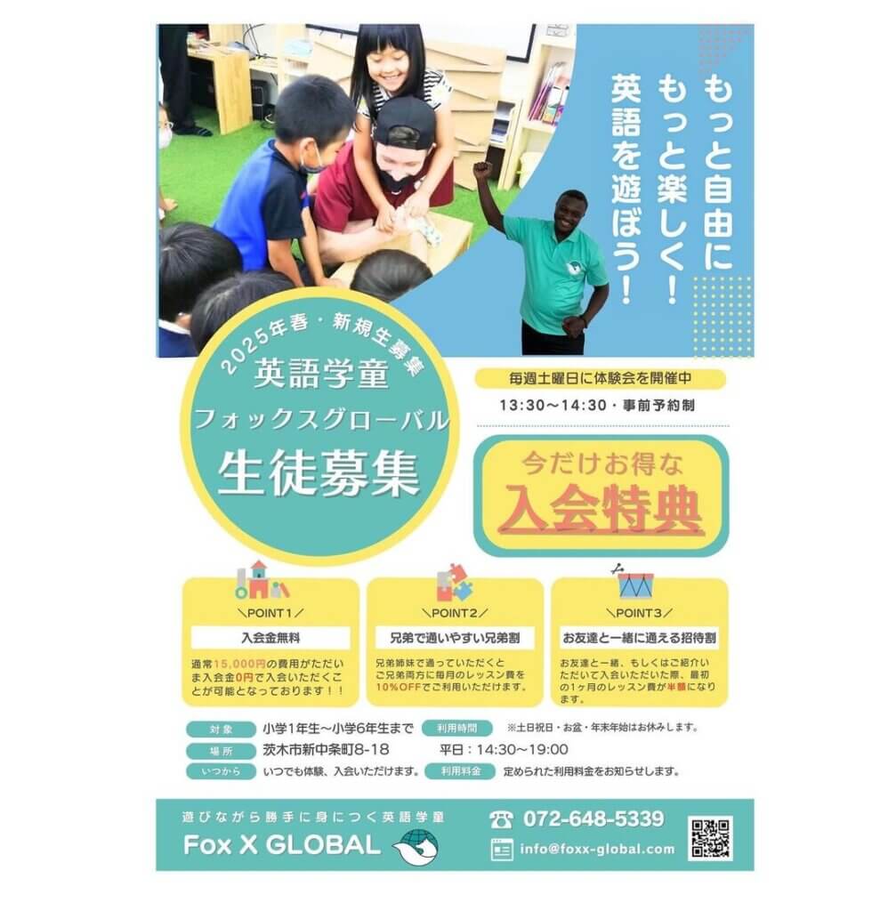 毎週土曜日は無料の体験レッスンをやっているからまずは参加してフォックスグローバルの雰囲気や先生の事を知ってみよう! 【フォックスグローバル体験レッスン】 ・開催日時 →毎週土曜日 箕面小野原校:11:00〜12:00 茨木校(中条、大池):13:30〜14:30 ・... -