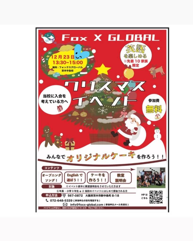 ※フォックスグローバルへのご入会を検討されている皆様へ※ この冬、フォックスグローバルに興味をお持ちの方へ向けて、クリスマスイベントと教室説明会を合わせて開催します! 【イベント概要】 日時 12/23(土)13:30〜15:00 場所 大阪府茨木市中条町8-18 ... -