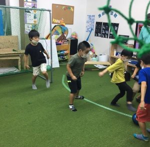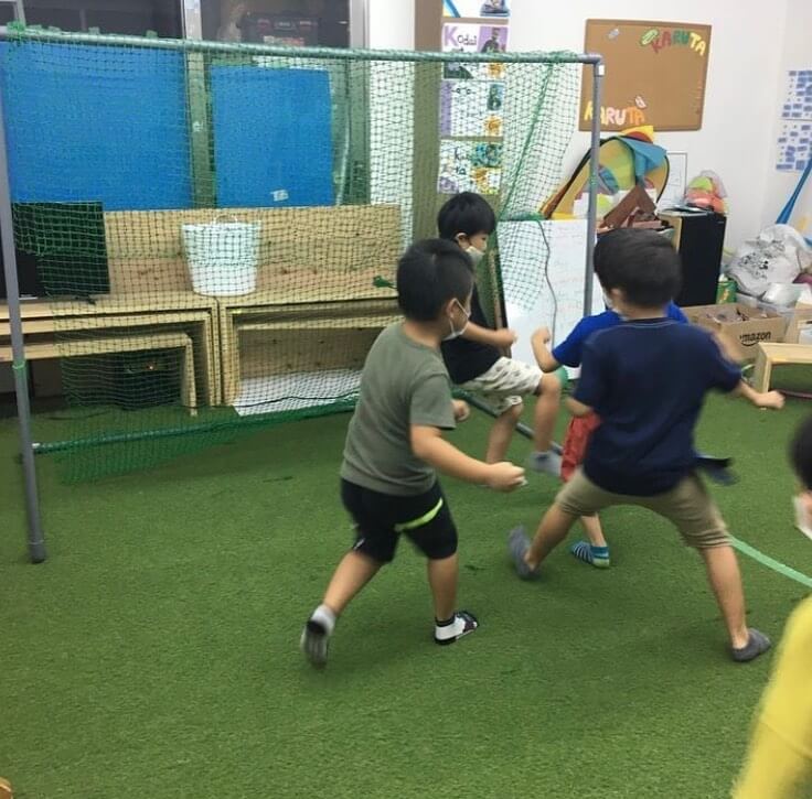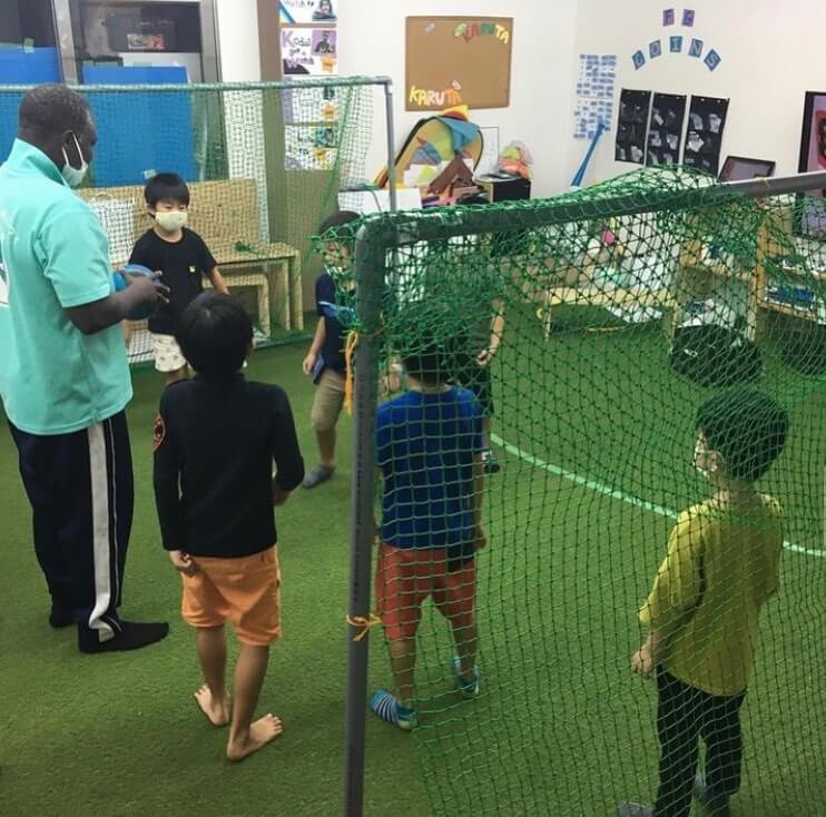 フォックスグローバルは床が全面芝生という事で、みんなでサッカーゴール、そしてオリジナルサッカースタジアムを教室の中に作ったよ!!