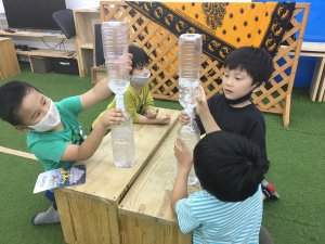 水とペットボトルで渦を起こし【tornado(竜巻)】のメカニズムを勉強したり、